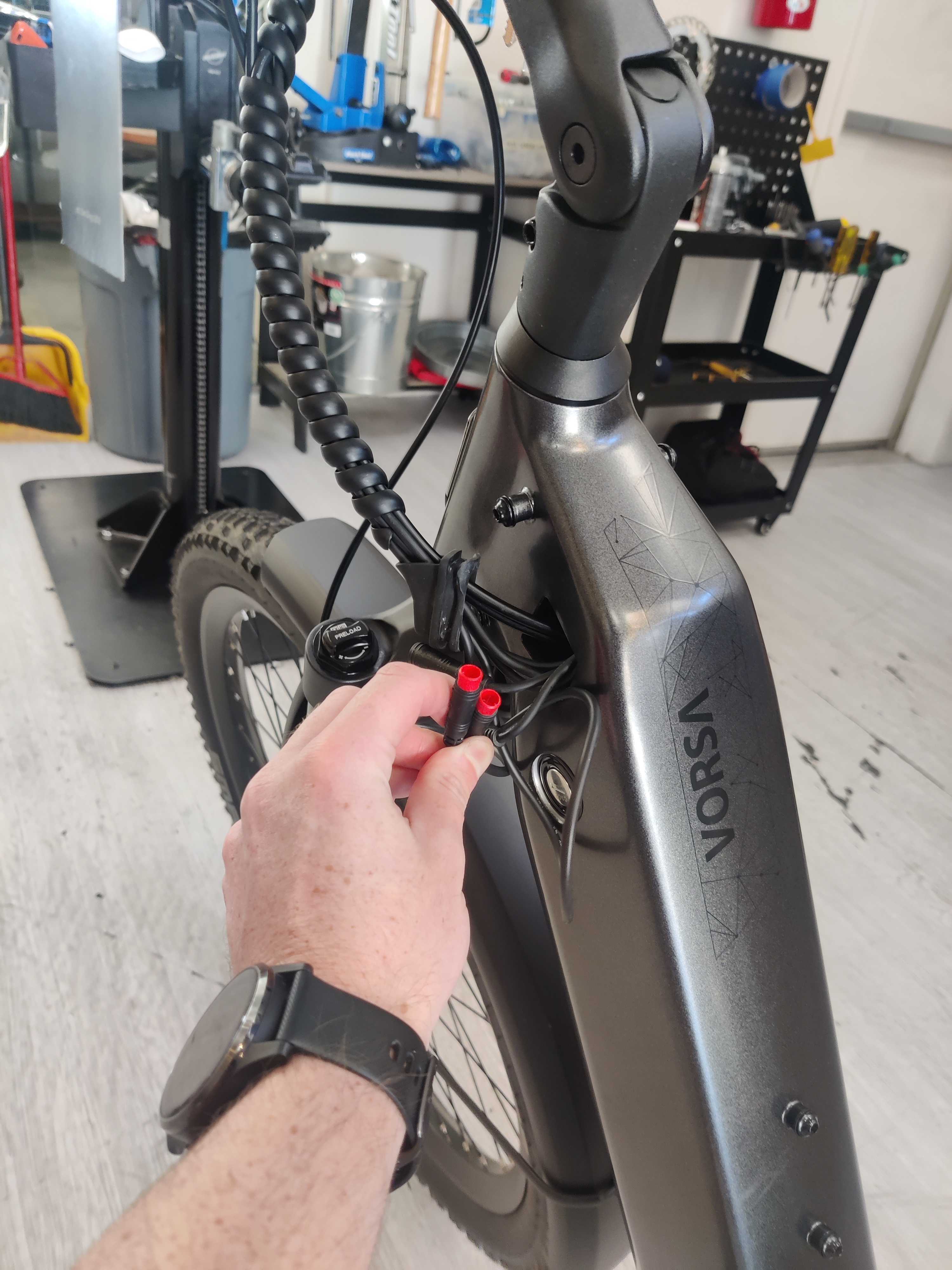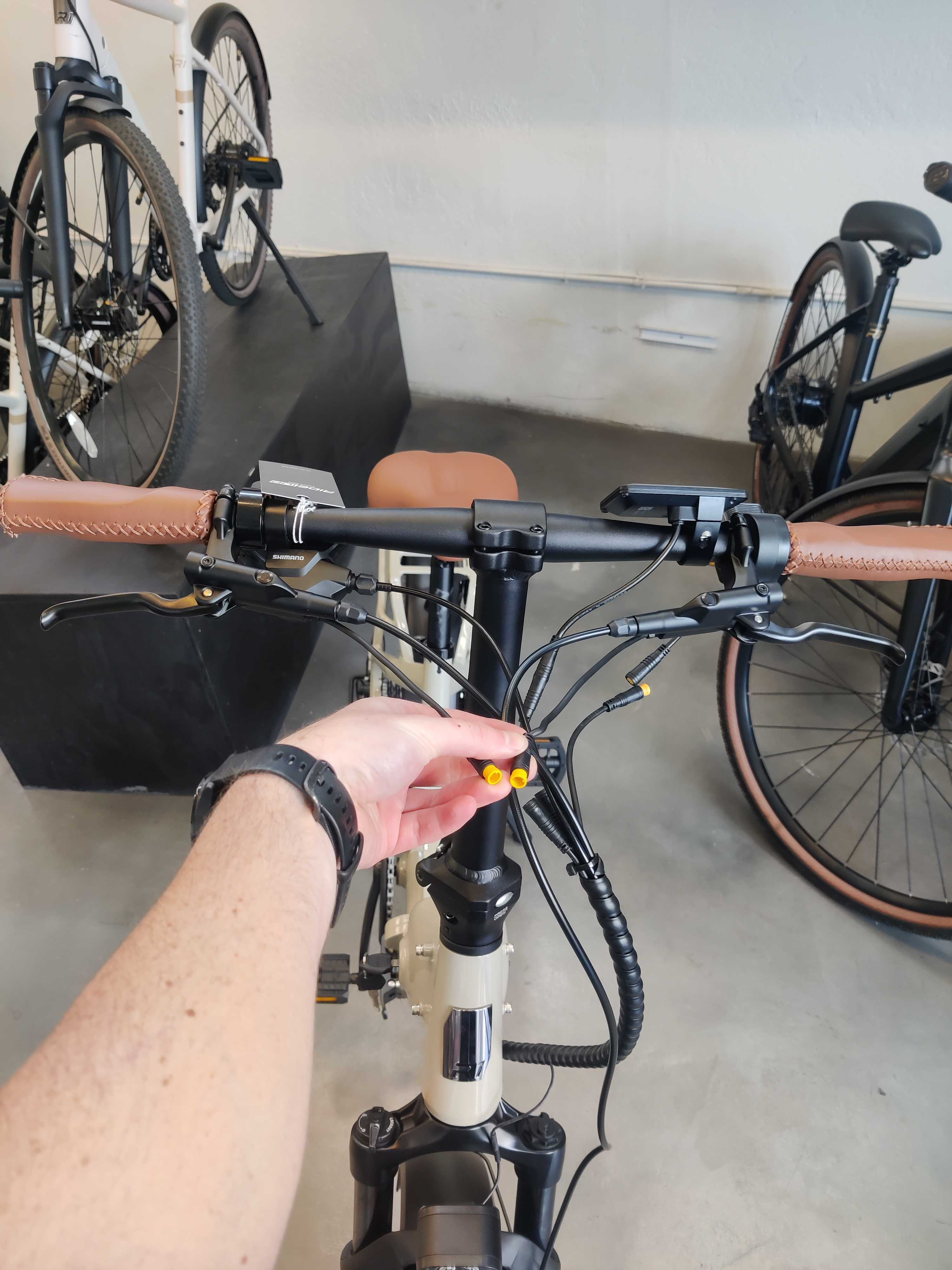 - Undo the spiral cable wrapping and trace the brake sensor wire from the brake lever to the sensor connector. This connector could be close to the handlebars, close to the frame, or even just inside the frame as shown in there reference photos below.