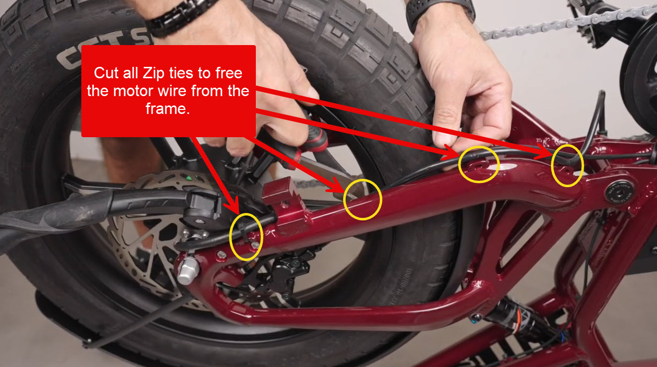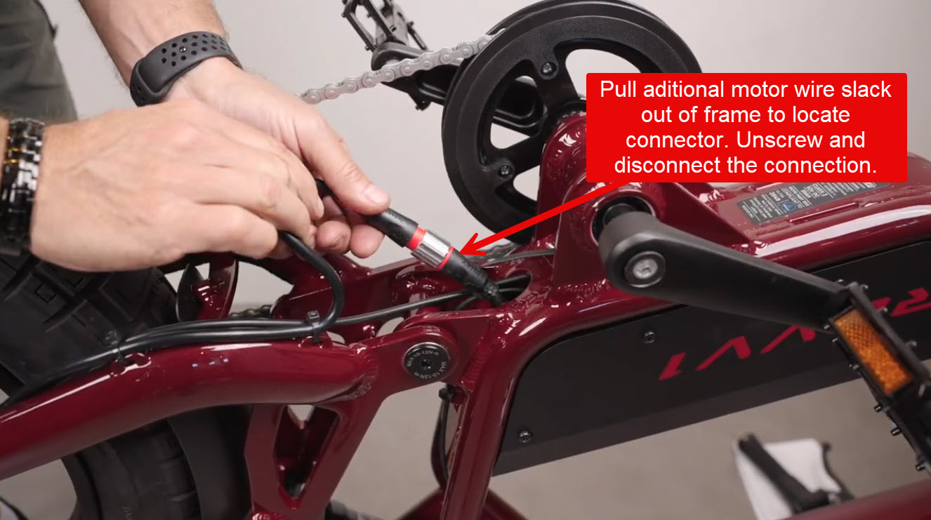 The motor wiring will have to be disconnected from the bike by both unplugging the electrical connector and cutting the zip ties that hold it to the frame. You should be able to see the zip with the bike flipped over and can access the electrical connection by pulling the extra wiring out of the hole near the bottom bracket.