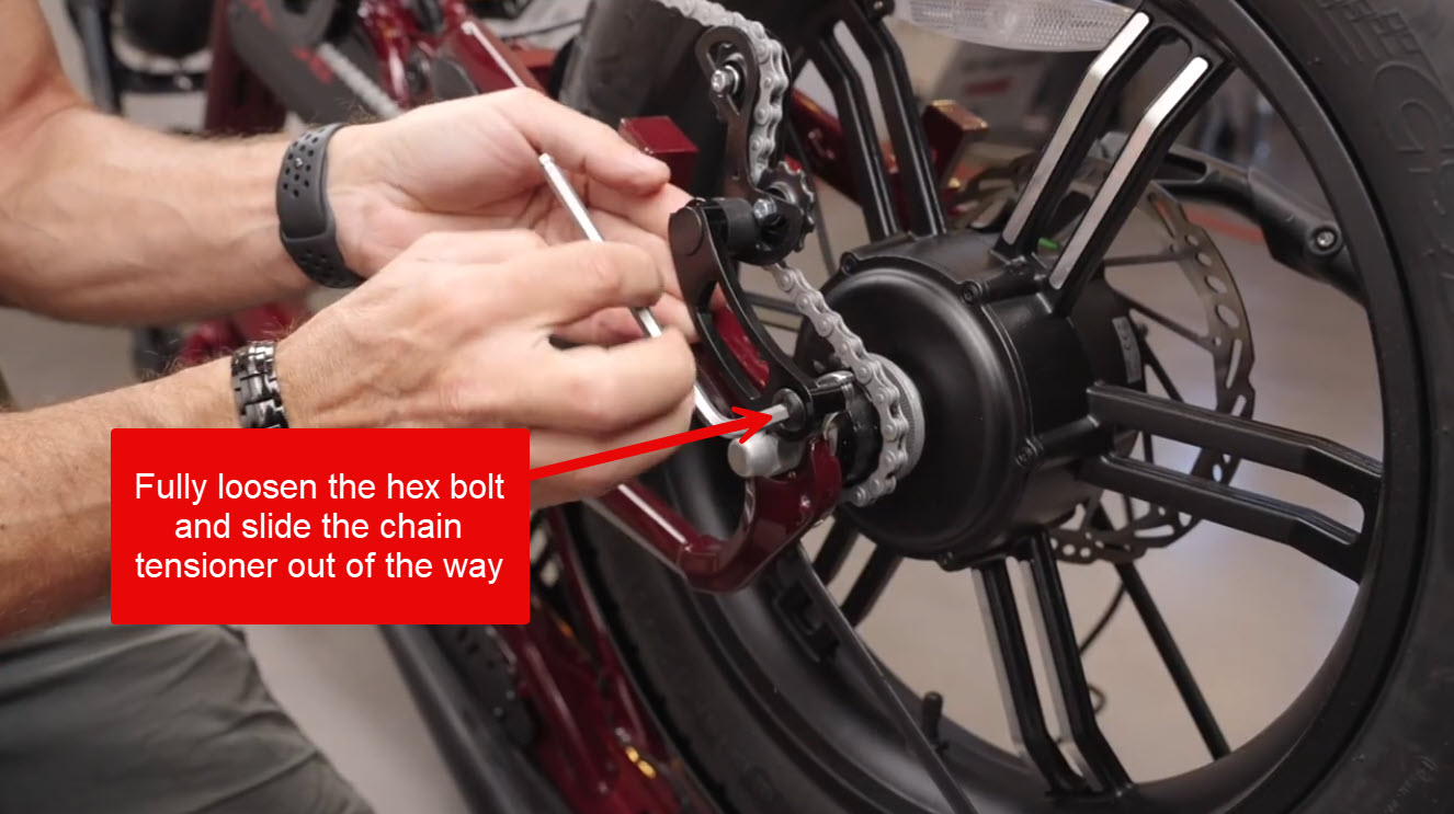 The chain tensioner will need to be removed to allow the wheel to pass by. Using a 6mm hex key, remove the fastener and slide the tensioner toward the front of the bike so it is out of the way. Please note that this is under spring tension and will want to spring towards the front of the bike. Firmly grasp the tensioner while removing the bolt to prevent this. With the tensioner out of the way, a 19mm wrench can then be used to remove the axle nuts.