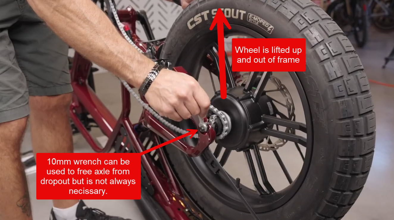 - If the wheel feels stuck in the dropout, a 10mm open ended wrench can be used on the flats of the axle to wiggle it back and forth as you pull the wheel out.