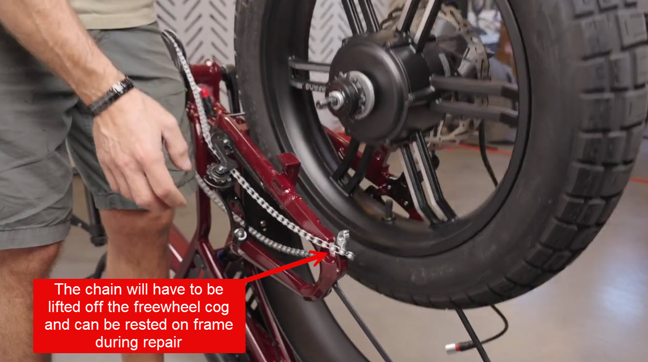 - As you pull the wheel up and out of the frame you will need to remove the chain from the freewheel cog and axle to fully free the wheel.