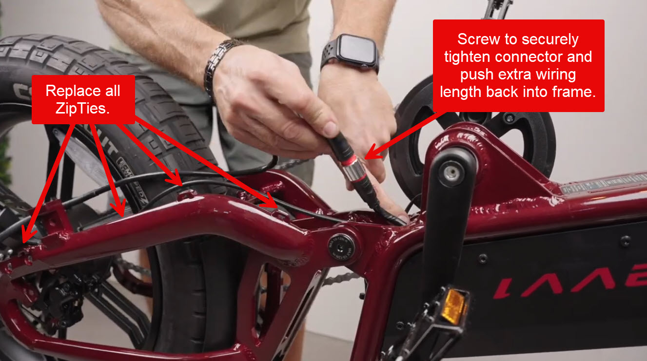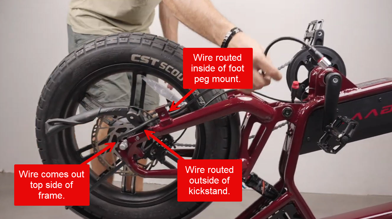 The motor wire can now be reconnected and zipties replaced. Take care to ensure the wire comes out the top side (bottom when the bike is right-side up) of the frame, goes outside of the kickstand, and on the inside of the foot peg mounts. Routing the wire in any other way can cause rubbing on the brake rotor or tire and subsequent damage.