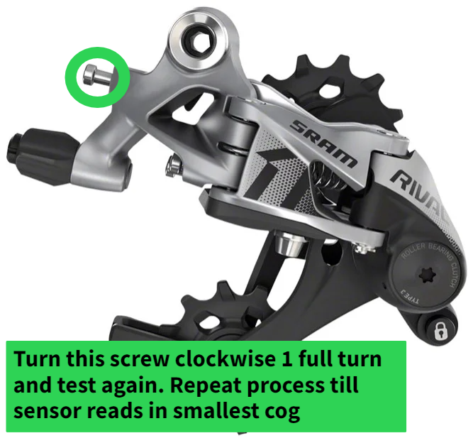 As mentioned above, the cadence sensor sends a signal every time a tooth of the small cassette cog passes by the sensor. If the chain is obstructing the sensor, it cannot read the cassette movement and will cause the assist to never or inconsistently engage. The way to resolve this is to tighten the B tension screw on the derailleur to allow for more room between the chain and the littlest cog.