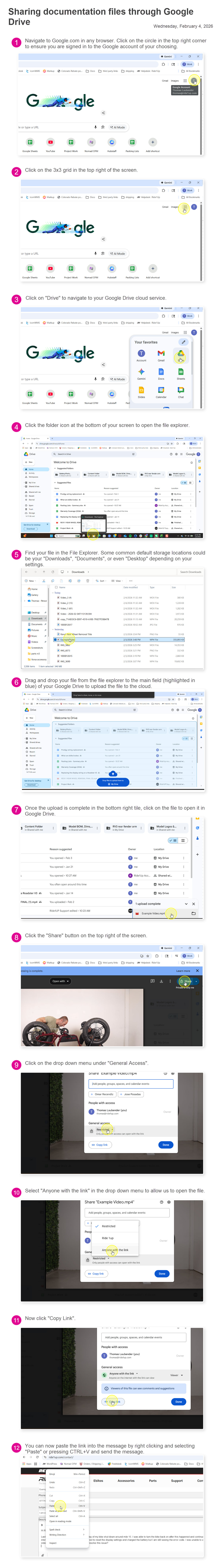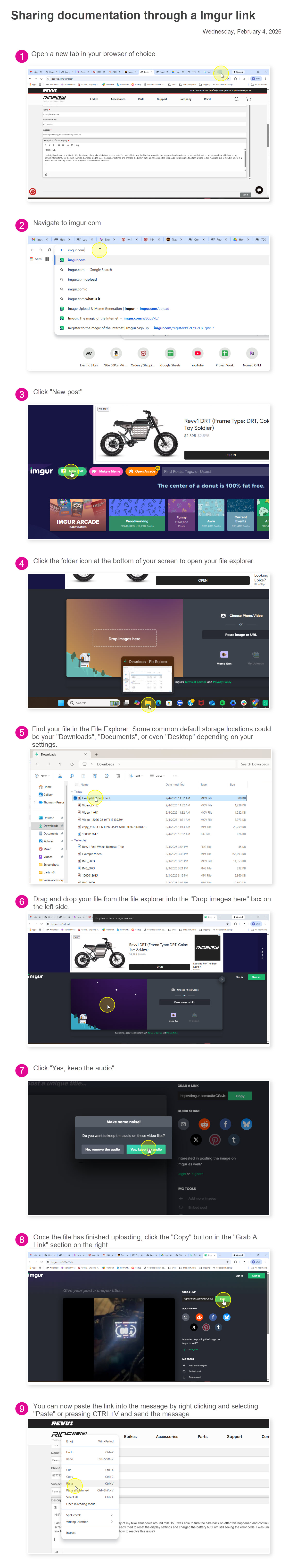 Both Google Drive and Imgur.com are great ways to share files with us as most people already have a google account set up and imgur files can be uploaded and sent without even creating an account. This documentation can be shared with our knowledgeable customer support agents here: https://ride1up.com/contact/